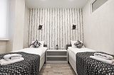 Общая площадь помещения - 35,5 квадратных метров. Несмотря на параметры помещения, она очень удачно спланирована: спальная комната, где установлены две двуспальные кровати, еще одна спальная комната, где установлена большая комфортабельная двуспальная кровать. Также кухня-гостиная, где можно проводить время с семьей.