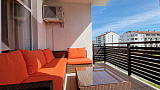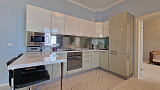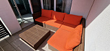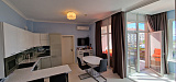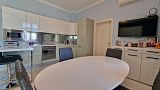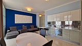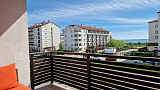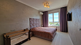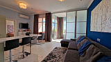 Апартамент спланирован в 1 изолированную спальную комнату со своим гардеробом, просторную кухню с обеденной зоной, гостиная с зонированием еще одной спальной комнаты, откуда осуществляется выход на террасу! Кстати как раз с террасы открывается вид на море и горячие закаты! Его общая площадь составляет 75 квадратных метров.