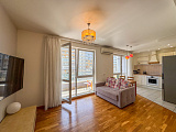 В квартире сделан качественный ремонт. Планировка включает просторную кухню-гостиную, отдельную спальную зону и открытый балкон с видом на море и горы.