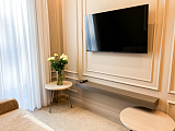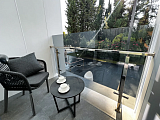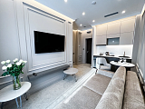 В апартаментах выполнен новый дизайнерский ремонт, который отличается не только визуальной эстетикой, но и действительно высоким качеством своего исполнения. Мебель и техника подбирались авторами проекта в полном соответствии с общей тематикой оформления пространства. Панорамные окна наполняют комнаты светом, а также позволяют любоваться прекрасным видом на территорию комплекса и субтропическую зелень.