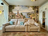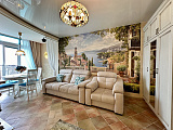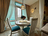 Основа стилистической концепции интерьера, как мы уже отмечали выше – это средиземноморская тематика. Просторная гостиная, объединенная с кухней, встречает теплыми оттенками и натуральными материалами. Большие окна наполняют пространство светом и воздухом, создавая ощущение легкости и свободы. Деревянная мебель и аксессуары придают интерьеру особый шарм и изящество. Обязательно стоит побывать тут лично, чтобы в полной мере насладиться царящей внутри атмосферой уюта.