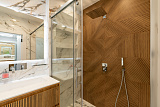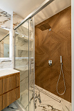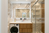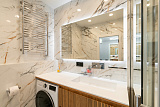 Общая площадь представленной квартиры – 64,4 м2. Выделено две непроходные спальные комнаты, кухня, объединенная с гостиной, обособленная гардеробная зона. Большое внимание уделено зонированию пространства, поэтому квартира получилась действительно удобной для жизни. В этом, опять же, вы можете убедиться лично, посетив эту квартиру вместе с экспертами нашего агентства. Отдельный плюс – потрясающий вид из окон, который открывается буквально из любой точки.