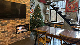 При входе в квартиру вас встречает просторная гостиная с большими окнами от пола до потолка, которые открывают захватывающий вид на величественные горные вершины. Мягкий свет проникает внутрь, создавая атмосферу тепла и уюта. Здесь можно расслабиться на стильном диване, наслаждаясь теплом камина и звуками природы за окном.