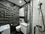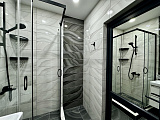 Особое внимание уделено душевой зоне, которая является отдельным произведением искусства. Стеклянная перегородка с бронзовым покрытием, идеально прокладка плитки с соблюдением геометрии, а также зеркальные панели на полу, создают впечатляющий эффект и добавляют элегантности и роскоши в пространство.
