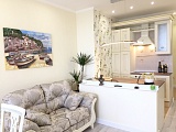 Первое, что бросается в глаза при визите сюда – это, конечно же, стильная авторская отделка. В основе интерьера здесь лежит умопомрачительное сочетание элегантного классицизма и романтичного средиземноморья. Преобладает светлая палитра красок, которая визуально делает пространство еще более просторным, легким и уютным.