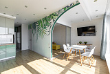 Площадь квартиры – 52 м2. Внутри выделено две спальных комнаты. Зона кухни объединена вместе с гостиной. Большое внимание авторы проекта уделили вопросу зонирования пространства. Столовая и гостиная располагаются напротив большого панорамного окна, что позволяет наслаждаться отдыхом, любуясь восхитительной панорамой. Спальные комнаты – просторны и светлые. Здесь детально продуманы системы хранения и световые точки.