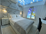 Общая площадь апартаментов – 14 м2. Небольшой метраж компенсирован детально продуманным зонированием пространства. Здесь выделена полноценная зона отдыха, санузел, а также небольшое рабочее пространство и мини-кухня. Большое внимание уделено организации зон для хранения вещей хозяев или арендаторов – есть прикроватные тумбы, столы с выдвижными ящиками. Очень качественный ремонт – отдельный плюс в копилку достоинств.