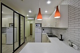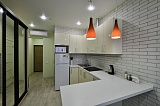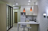 Площадь предложенной к продаже студии – тридцать квадратных метров. Зонирование выполнено с помощью продуманного дизайнерами плана расстановки мебели. Кухня отделена от основной зоны барной стойкой, выполняющей одновременно и функцию обеденного стола. В зоне спальни установлена двуспальная кровать, гостиная вынесена на лоджию с панорамными окнами в пол.