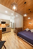 Общая площадь апартамента – 40 квадратных метров. Внутреннее пространство здесь оформлено в современном лофт-стиле, который основывается на оригинальной игре природных фактур, функциональности и эстетике. Мебель, декор, элементы освещения, текстиль – все подобрано в соответствии с общим концептом оформления, ввиду чего интерьер здесь выглядит очень гармоничным и имеет абсолютно завершенный образ. Есть свой собственный выход на придомовую территорию – ухоженную зеленую лужайку, где Вы вместе с семьей сможете организовать пикник, или же просто насладиться тишиной и спокойствием.