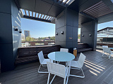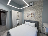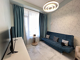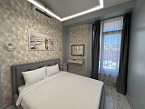 В квартире есть просторная спальня с большими окнами, через которые проникают утренние лучи солнца и открывается живописный вид на море. Изюминкой является, второй уровень, на котором расположена рабочая зона и прекрасный раскладной диван.  Ванная комната выполнена в современном стиле и оснащена всем необходимым для комфортного пользования.