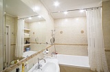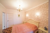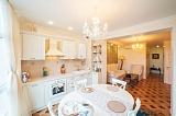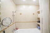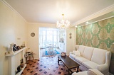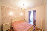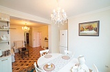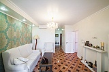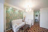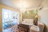 Квартира двухкомнатная. Площадь ее составляет 53 квадратных метра. Дорогой евроремонт. Все комнаты полностью меблированы и оборудованы бытовой и климатической техникой. В спальне стоит большая двуспальная кровать, сделана небольшая гардеробная, туалетный столик. В гостиной, объединенной с кухней, - кухонный гарнитур (шкафчики, плита, холодильник и т.д.), большой диван, обеденный стол, тумбочка с телевизором. Санузел отделан дорогой итальянской плиткой.
