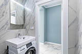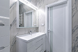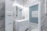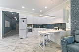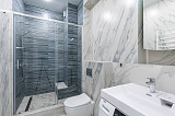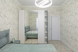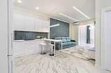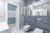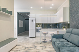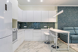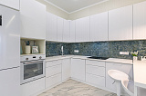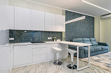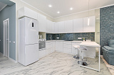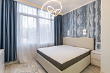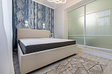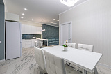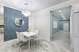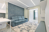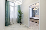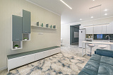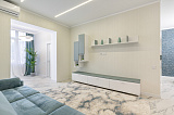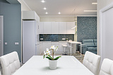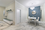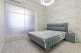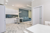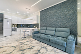 Площадь квартиры - 100 м2. Ее пространство очень гармонично поделено на 2 непроходные спальные комнаты и кухню, совмещенную вместе с гостиной зоной. Количество санузлов - 2. Внутренняя отделка здесь покоряет своей эстетикой и шиком. Продумана каждая деталь: от материалов отделки до декора, текстиля и фурнитуры. Основа интерьера - элегантная современная классика, которая максимально гармонично дополнена мотивации средиземноморской тематики. Вся мебель подобрана в строгом соответствии с общей стилистикой. Стоит на самом деле побывать в этой квартире и лично насладиться ее невероятной атмосферой!