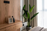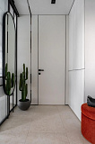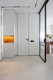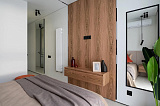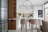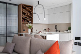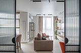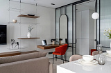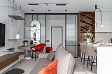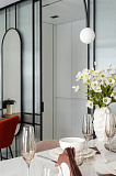 Сердцем квартиры является просторная гостиная, совмещенная с кухней, где эффектный кухонный остров превращает процесс готовки в настоящее творчество. Скользящие перегородки из фактурного стекла и темного металла создают интересное световое оформление и обеспечивают возможность гибкого разделения комнат. Отдельная спальня с вместительной гардеробной, освещенной приглушенным светом, отличается вниманием к каждой детали — от элегантного туалетного столика до грамотно организованных систем хранения.