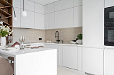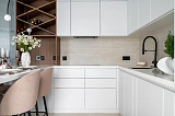 В ванной комнате с душевой кабиной увеличенного размера и дизайнерской инсталляцией царит атмосфера релакса, где черная сантехника удачно сочетается с нейтральными оттенками натуральных материалов. Кухня, оснащенная современной техникой высокого класса и продуманной системой освещения, воплощает собой идеальное единство стиля и функциональности.