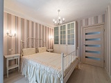 Общая площадь представленной квартиры составляет 43 кв.м. Её внутреннее пространство удобным образом поделено на компактную изолированные спальню и кухню, совмещенную вместе с гостиной комнатой. Из больших витражных окон открывается очень красивый вид на зеленую парковую зону. Что касается отделки, то, просмотрев фотографии, Вы можете отметить факт очень стильного дизайнерского ремонта, выполненного в сочетании неоклассики и мотивов средиземноморья. Продажа осуществляется вместе со всей мебелью и бытовой техникой, что идеально подходит для иногородних покупателей, у которых нет времени на то, чтобы ждать окончания отделочных работ и заниматься благоустройством жилища.