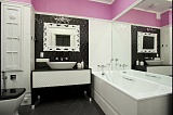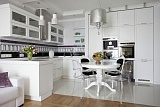 В дизайне квартиры использованы яркие, светлые тона, что делает интерьер жизнерадостным, а витражное остекление от пола до потолка делает квартиру еще светлее. Использованы качественная мебель и материалы. Планировка квартиры: большая кухня-гостиная, спальная комната, детская, 2 санузла, прихожая. Зона кухни от гостиной отделена лишь визуально, паркет заменяется плиткой. Пол теплый. Модные и дизайнерские вещи отлично вписываются в классический интерьер. Зеркала увеличивают пространство.
