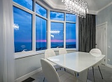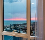 Из больших панорамных окон открывается потрясающий вид на море и морской порт. Хорошо просматривается и городская панорама, видно торговую галерею.