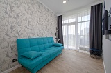 Выделена уютная светлая спальня и просторная кухня-гостиная с выходом на собственный балкон, на котором установлена ротанговая мебель. Благодаря панорамным окнам в квартире очень светло и уютно. Также стоит отметить удачное расположение квартиры. Окна выходят на западную сторону, что, во-первых, делает ее не слишком жаркой летом, а во-вторых, позволит Вам каждый вечер наслаждаться красивейшими закатами нашего города!