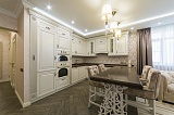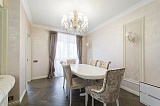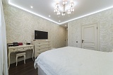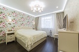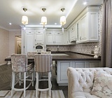 Интерьер жилища очень оригинально и изысканно сочетает в себе современную классику и романтичные мотивы стиля прованс. Мебель и текстиль во всех комнатах подобраны в соответствии с общей тематикой оформления, за счет чего квартира выглядит очень гармонично. Светлая палитра красок визуально расширяет границы пространства, а также наполняет его непередаваемой легкостью, теплотой и уютом.