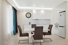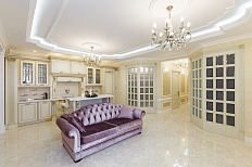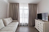 Пространство квартиры поделено на три спальни и кухню, которую дизайнеры предпочли объединить вместе с гостиной комнатой. Установлена очень дорогая бытовая техника и современное климатическое оборудование.