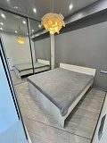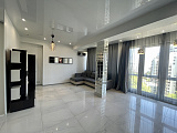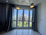 Квартира очень светлая и просторная, так как имеет панорамные окна и высокие потолки. В ней есть все необходимое для комфортного проживания: выделенная спальня, уютная кухня-гостиная и совмещенная ванная комната.