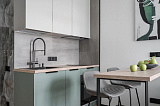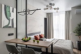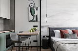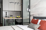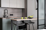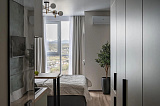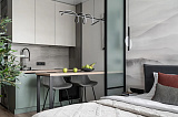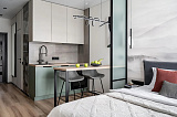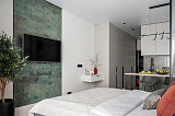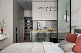 * Удобное зонирование: кухонная область объединена с обеденной стойкой, рассчитанной на двоих; предусмотрена спальная зона с двуспальной кроватью.