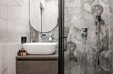 * Ванная комната оснащена душевой кабиной, облицована крупноформатной керамической плиткой, имеется ниша для хранения вещей.