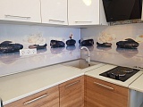 Стены комнаты оклеены светлыми обоями, напольное покрытие – мраморная матовая плитка. Зона кухонного фартука украшена декоративной панелью, которая надежно защищает стену от брызг и пятен.