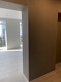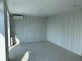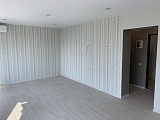 Для оформления пространства выбрана нейтральная палитра красок. Стены оклеены обоями, а роль напольного покрытия выполняет паркетная доска. Мебель, технику и светильники покупателям предстоит выбрать по своему личному усмотрению.