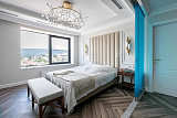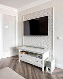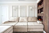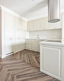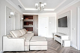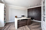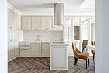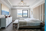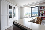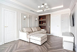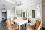 Изысканная отделка в светлом классическом стиле, украшенном декоративными элементами, создает атмосферу элегантной роскоши. Пол, выполненный в виде елочки из прочных материалов, система кондиционирования, скрытая в стенах, и интегрированные коммуникации подчеркивают высокий уровень исполнения. Встроенные шкафы по всему периметру сохраняют порядок и практичность интерьера.