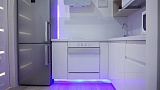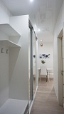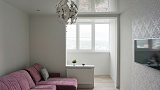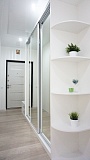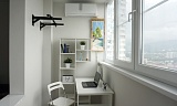 Студия традиционно подразумевает под собой отсутствие межкомнатных перегородок и стен. Выполнено удобное зонирование. Например, кухонная часть отделена от спальни столом, на лоджии оборудована зона рабочего кабинета. Санузел совмещенный.
