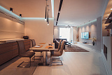 Площадь квартиры 113 квадратных метров, распланирована на просторную кухню-гостиную, спальню и детскую, а также санузел. Дизайн и отделка квартиры выполнена по индивидуальному проекту, с применением высококлассных и дорогостоящих материалов. Установлена мебель и техника ведущих европейских брендов, таких как Bosch, Electrolux и Miele. Итальянская кухня Valcucine.