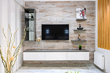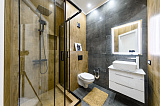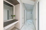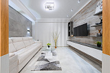 Площадь квартиры – 90 м2. За счет продуманной планировки, она отлично подходит для семей из 3-4 человек. Две просторные спальни, два санузла, гостиная совмещенная с зоной кухни. Отдельный плюс – грамотное зонирование.
