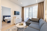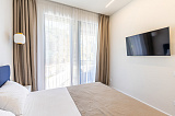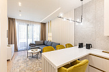Апартаменты очень грамотно распланированы: две полноценные спальные комнаты, одна из них с собственным санузлом с душевой, прихожая с гардеробом, уютная гостиная совмещенная с кухонной зоной и отделена барной стойкой. Так же имеется открытый балкон с видом на море. Отличный вариант для комфортного проживания и отдыха на самом берегу черного моря!