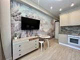 Эта квартира полностью укомплектована кухней с плитой, холодильником, чайником, СВЧ и всей необходимой посудой. Также имеются телевизор, кондиционер, раскладной диван, стол и стулья, стиральная машина и шкаф. Предлагаемый объект имеет свое патио на улице.