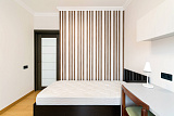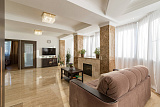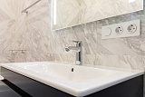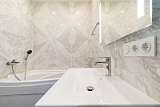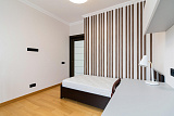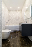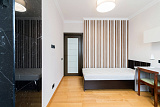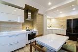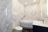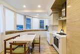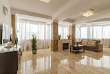 В квартире выполнен ремонт высокого класса исключительно из натуральных отделочных материалов. Очень удобная и просторная планировка, которая включает в себя: кухню площадью 16 м2, гостиную 50 м2, две спальные комнаты, прихожую и роскошную ванную комнату из натурального мрамора 2-х сортов. Кухня укомплектована бытовой техникой лучших европейских производителей таких как Bosch (Производства Германия), AEG, Hitachi. Кондиционирование в каждой комнате фирмы Mitsubishi (тепло-холод). Полы в прихожей, гостиной, ванной и кухне выполнены из натурального мрамора и травертина, отшлифован в единое целое и отполирован. Широкие подоконники по всей квартире из натурального мрамора, выполненные по индивидуальному заказу.