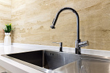 В центре гостиной расположен встраиваемый электрокамин фирмы Dimplex с функцией обогрева. Портал камина выполнен из натурального травертина в обработке Антик.