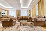 Территория дома огороженная, охраняемая, все под видеонаблюдением; облагороженная; оборудованная детская площадка с зонами барбекю; физкультурно - оздоровительный центр, где есть и бассейн, сауна, баня, раздевалки, фитнес зал и зона отдыха.