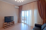 Квартира общей площадью 100 м2, с евроремонтом ,распланирована на кухню-гостиную и 3 комнаты, изолированные друг от друга. Лоджия с витражным остеклением, с панорамным видом на море .