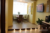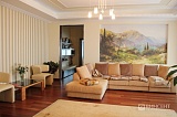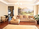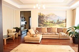 Зал,из котогрого можно выйти на открытую террасу,украшает настенное панно.На кухне установлен итальянский гарнитур,обеденная зона расположена на подиуме с подсветкой.
