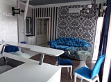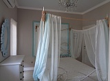 Интерьер исполнен в стиле "Авангард", в темно-бирюзовой и бежевой гамме. Спальни отдекорированны воздушной белой тканью балдахина, который располагает к приятному отдыху.