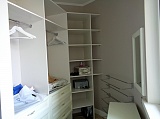 В одной из пален установлена гардеробная, что очень удобно и выгодно подчеркивает стиль квартиры. Морская тематика просматривается во всем - зеркала, комоды, люстры и другие элементы интерьера - всё говорит о том, чтобы хозяева не забывали, что живут на Чёрном море.