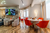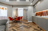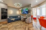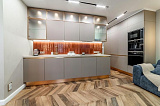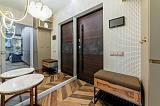 Интерьер квартиры выполнен с большим вниманием к деталям: элегантный дизайн, безупречная чистота и грамотное зонирование создают атмосферу роскошного релакса. Летом жителей комплекса ожидает возможность освежиться в бассейне, расположенном на территории.