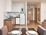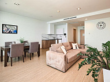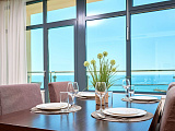 В просторной гостиной расположена кухня, где удобно готовить и наслаждаться трапезой, любуясь морскими пейзажами с балкона. Гостиная также включает обеденную зону, рассчитанную на шесть человек, двуспальный диван и большой современный телевизор.