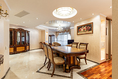 Интерьер воплощает авторский дизайнерский проект с современным ремонтом и мебелью премиальных брендов, создавая атмосферу уюта и роскоши. Каждая деталь здесь говорит о статусе и изысканном вкусе владельца.