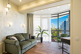 Квартира очень просторная и уютная, отлично распланирована: просторная кухня гостиная, она же столовая с шикарным морским видом, две спальные комнаты с гардеробными, одна спальня с выходом в кабинет. В квартире выполнен новый дизайнерский ремонт с применением дорогостоящих материалов. Квартира полностью укомплектована всей необходимой мебелью и техникой. А за более подробной информацией, звоните! И мы с удовольствием поможем Вам с выбором элитной недвижимости в городе Сочи!