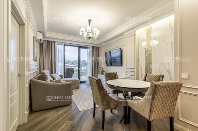 Предлагаются к продаже новые дизайнерские апартаменты в комплексе класса де-люкс "Актёр". Эти роскошные апартаменты очень грамотно распланированы и представляют собой шикарную современную многофункциональную кухню выполненную в виде подковы переходящую в большой зал-гостиную с обеденной зоной. Далее 2 спальные комнаты, одна с выходом на открытую террасу с видом на море и горы, а вторая спальня закрытого типа с витражами и гардеробом. Совмещенный санузел с душевой и отдельная кладовая/гардеробная очень компактно уместились.