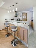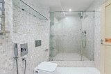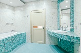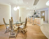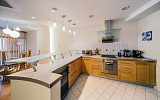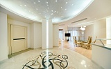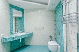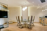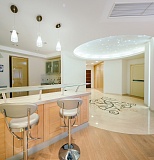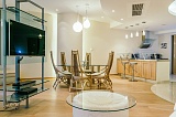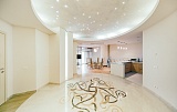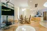 Квартира общей площадью 150,1, м2, включая подсобное помещения с отдельным входом из общего коридора 4,2м2. Машиноместо (спуск на лифте) в домашней автостоянке 28,1м2. Балкон-лоджия с прекрасным видом 20,7м2 Полезная площадь состоит из прихожей (6,3м2), центрального холла(15,5м2) и двух блоков Спальный блок хозяев с небольшим коридором(5,2м2), в котором расположены детская спальня (24,3м2), спальня для взрослых(20,7м2), ванная комната с туалетом(8,5м2). Гостиный блок, включающий в себя саму гостиную (в ней же и столовая зона)(43м2), кухню(10,2м2), хозяйственный блок(5,9м2) и гостевой туалет с душем(6,3м2). Потолки по всей квартире фигурные. Особенно, интересен потолок в круглом центральном холе в виде звёздного неба, с точной копией созвездий, таких как Большая и малая медведицы. Шторы из натуральных материалов шёлка и льна. Очень интересные шторы в детской, сшитые по индивидуальному дизайну. Обстановка в квартире. Когда Вы заходите в квартиру прихожая и центральный холл являются её визитной карточкой. Оформление пола выполнено из натурального мрамора в виде ключа. Центральный холл круглый, сделан в виде орнамента из разных сортов мрамора. В прихожей расположен очень удобный встроенный шкаф-купе с большими стеклянными дверьми производства Италия. Из прихожей мы можем попасть в гостевой туалет с прекрасным оформлением, оснащённым умывальником, туалетом и удобным душем. Сантехника производства Италия. Войдя в центральный холл мы можем попасть в хозяйскую (спальную) зону или в гостиную зону. Гостиная зона состоит из трёх частей и выполнена в светлых спокойных тонах: Сама гостиная с удобным угловым диваном, кофейным столиком и двух пуфиков производства компании «mobel & zeit». Столовая зона. Барная зона - кухня. В гостинной зоне очень удобно расположен телевизор-ЖК панель «Samsung» на динамичной прозрачной стойке, которая имеет угол поворота на 360 градусов. В диване встроены два мини бара с подсветкой, один из которых с пультом управления. Также у дивана есть два спальных места и ящики для белья. В столовой зоне мебель из ротанга производства Въетнам, стол стеклянный на 8 мест и очень удобные стулья. В кухне фасады из натурального белёного дуба производства компании «Verona», единая столешница из искусственного камня. Кухня оборудована надёжной техникой (посудомойка «BOSH», духовой шкаф и варочная панель «Zigmund & Shtain» Германия, дизайнерская вытяжка производства Италия, винный холодильник под столешницей с двумя отделами «LIEBHERR», СВЧ «BORK»). Зону кухни отделяет от столовой зоны удобная и красивая барная стойка, выполненная из матового стекла производство Германия. Есть два выхода на балкон с красивым видом на парк пансионата «Мориса Тереза». Уровень – кроны деревьев. Из зоны кухни мы попадаем в хозяйственный блок, где расположены два встроенных холодильника «LIEBHERR». Один из них состоит и холодильной обычной зоны и морозильной камеры с лёдогенератором. Второй состоит из холодильной зоны с камерой BioFresh, где свежее мясо может храниться до 5 суток, и обычной морозильной камеры. Также в этом блоке находится большой трёхстворчатый шкаф витрина с набором посуды на 12 персон (Богемский фарфор, хрусталь и стекло), стиральная машина «Brandt» и мойка-фарфор для застирования белья. Войдя из центрального холла в хозяйскую зону мы попадаем в небольшой коридор, от куда мы можем пройти в детскую спаль