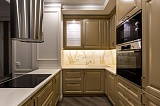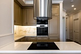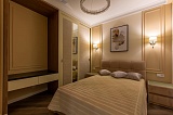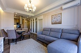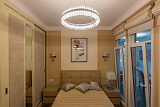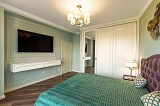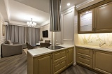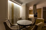 Внутри выполнен дорогостоящий дизайнерский ремонт. Продумана абсолютно каждая мелочь: от отделочных материалов до текстиля и фурнитуры. Установлена мебель и техника, которые также были подобраны в соответствии с общей тематикой убранства. Дорогие светильники, люстры. В основе оформления - элегантная современная классика, которая гармонично переплетается с мотивами ар-деко.