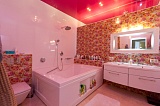 В спальне имеются отдельная, собственная гардеробная и большая ванная комната с гидромассажной ванной. А в гостевом санузле установлена душевая кабина. В гостиной есть большой аквариум, в котором живут экзотические рыбки, ракообразные и другие обитатели морей и океанов — он придает общей атмосфере изысканность и умиротворение.